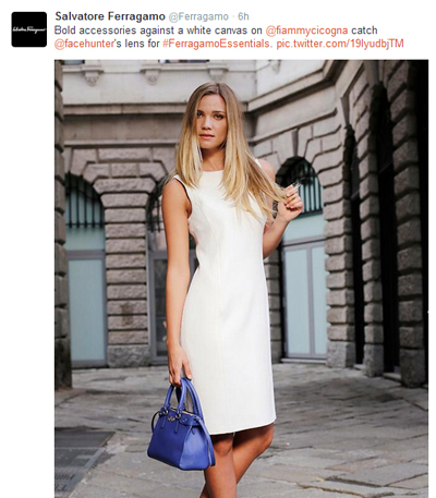 For instance, Ferragamo ran a week-long series of images shot by bloggers on its Twitter and Instagram exclusively using the branded hashtag #FerragamoEssentials. Since it worked with well-established bloggers, the brand benefited from the additional audience it received from the bloggers’ own tweets about the project (see story).