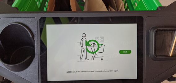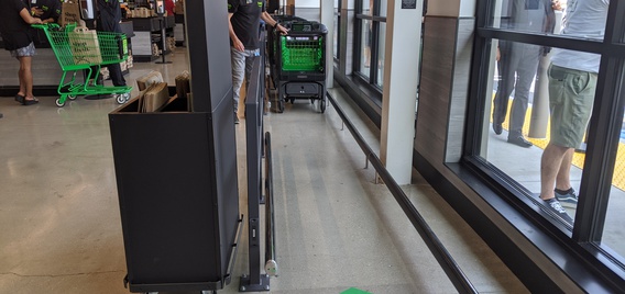 Customers using Dash Carts must exit the store through a specified lane. As shoppers walk past the green area, their carts will automatically check out with the card on file, and an employee is on hand to answer questions and ID any customers with alcohol purchases. The carts must stay inside the store — the wheels will lock if taken outside — meaning customers have to carry their bags to their vehicles.