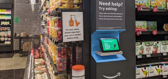 Amazon Echo Show devices are placed inside "Ask Alexa" stations positioned around the store. Service kiosks meant to help customers find items and check prices are familiar to shoppers, but the Alexa stations make it clear they offer additional information, like which wine to pair with a cheese selection or how many ounces are in a cup.