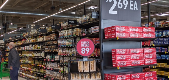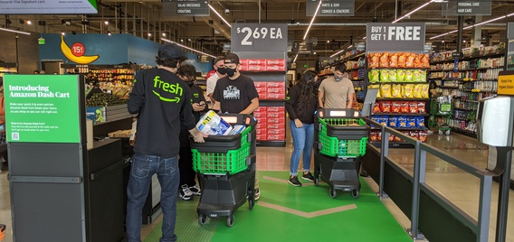 From the outside, the store looks just like a conventional grocery store, complete with ample parking, including designated slots for pickup, and large signs touting the grocer's low prices. But as shoppers enter the store, they'll quickly notice many Amazon-esque features, including the line of Dash Carts, Alexa stations placed throughout the store and strategically positioned QR codes that allow shoppers to order ahead or load coupons.