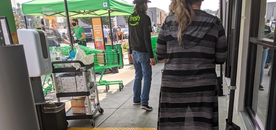To keep customers safe, the store had floor markers outside to keep shoppers waiting in line at least six feet apart. Store associates stood at the entrance regulating the number of customers allowed in. According to an Amazon spokesperson, the store is currently at 50% capacity due to COVID-19. Store associates are also sanitizing returned carts as customers leave the store.