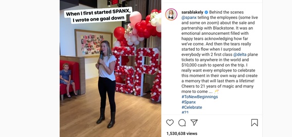 As Spanx founder Sara Blakely demonstrated this week, there are better ways to show one's employees one's appreciation. After selling a majority stake in her two-decade-old smooth-underwear company to investment firm Blackstone, a move that valued her brand at some $1.2 billion, Blakely hoisted her lucky red backpack, and tearfully toasted her mother and grandmothers, who she said struggled as women with few opportunities compared to men. She, like Bezos, thanked her employees with grateful words. But, unlike Bezos, she also surprised them with two first class plane tickets each, plus $10,000 cash as spending money, as tokens of that appreciation.