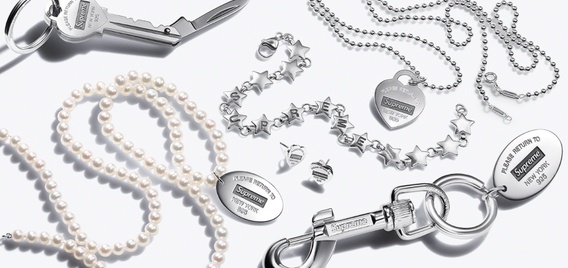 The Supreme x Tiffany collection of silver jewelry includes earrings, a heart pendant, pearl necklace, star bracelet, stud earrings, key rings and a T-shirt where Supreme's simple red logo is instead featured in Tiffany's robin's egg blue.