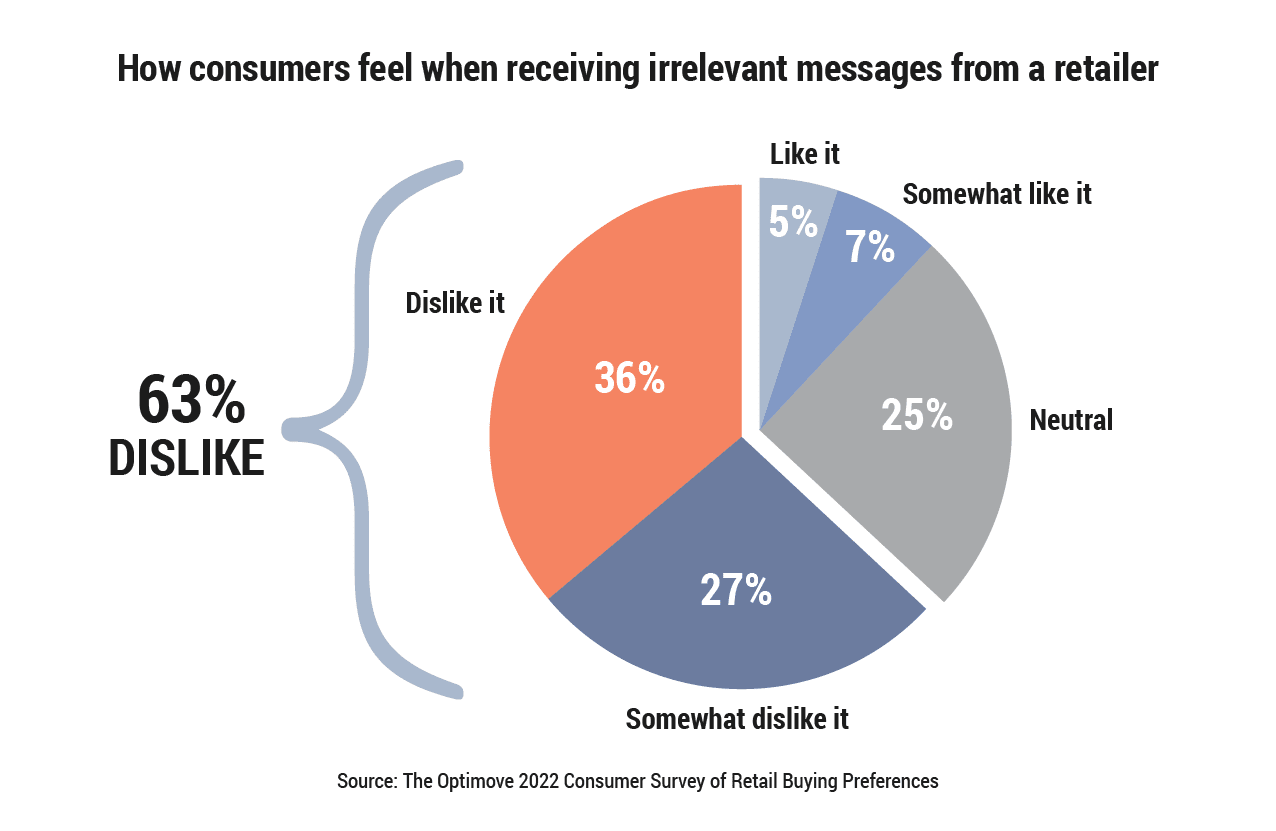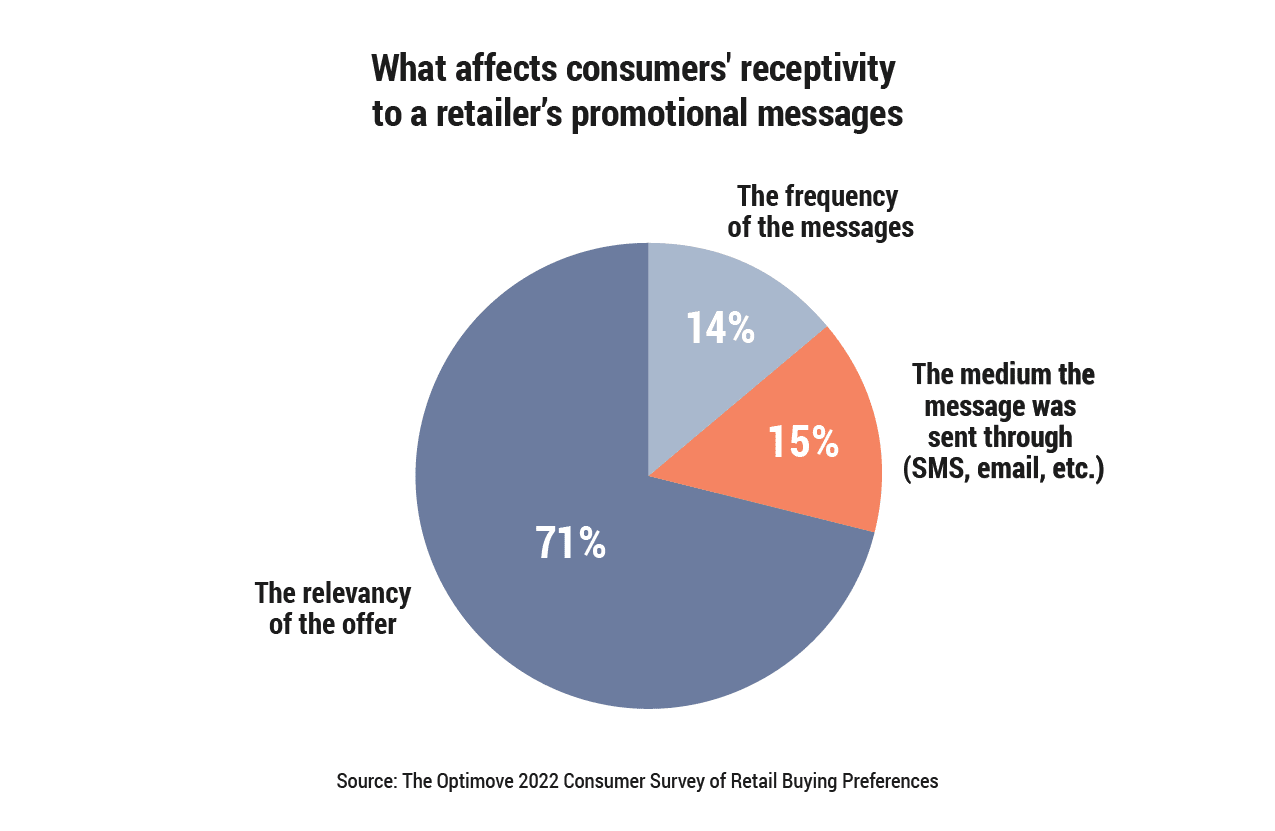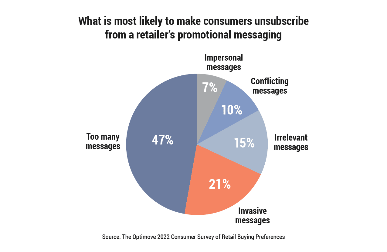 July 31, 2022 – Forty-seven percent (47%) of consumers said that they unsubscribe from a retailer's promotional messages if they get too many messages. Conversely, 71% say they are most receptive to promotional messages based on the relevancy of the offer, and 63% dislike receiving irrelevant messaging from a retailer. The results are from The Optimove 2022 Consumer Survey of Retail Buying Preferences, a survey of 500 consumers ages 18+. The survey was designed by Optimove and fielded by Survey Monkey in the second quarter of 2022.