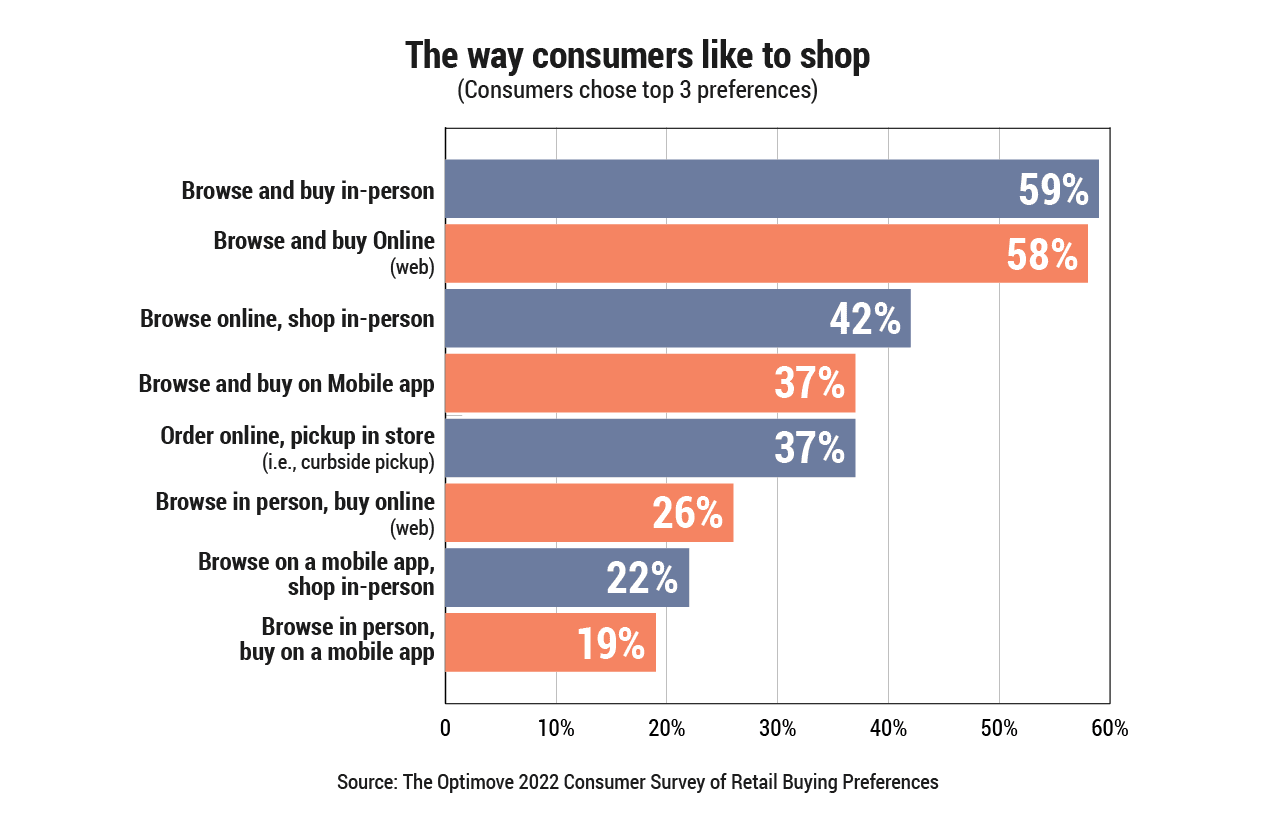 The survey also asked consumers the way they like to shop. Results show that the top two ways consumers like to shop are to "Browse and buy in-person:" 59%; and "Browse and buy Online (Web):" 57.60%. Forty-two percent (42%) chose; "Browse online, shop in-person."