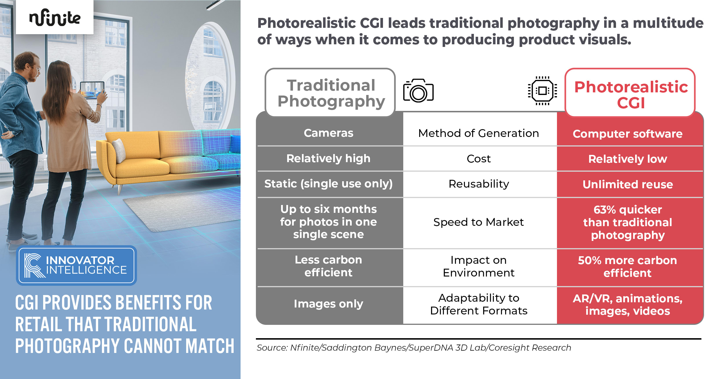 Nfinite, the leader in 3D visualization and e-merchandising for retailers, partnering with Coresight Research, today announced the release of the report, “CGI Provides Benefits for Retail That Traditional Photography Cannot Match.”